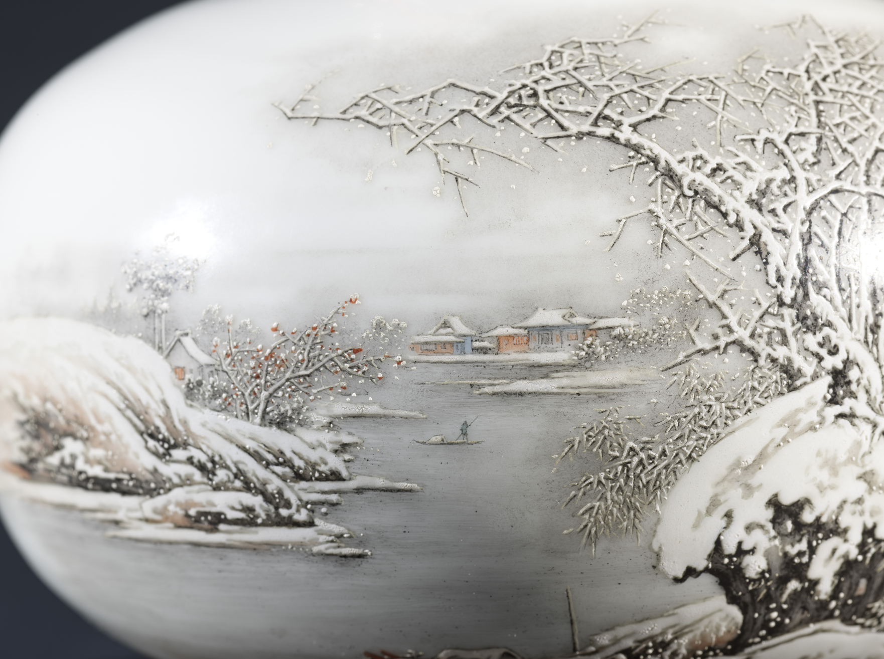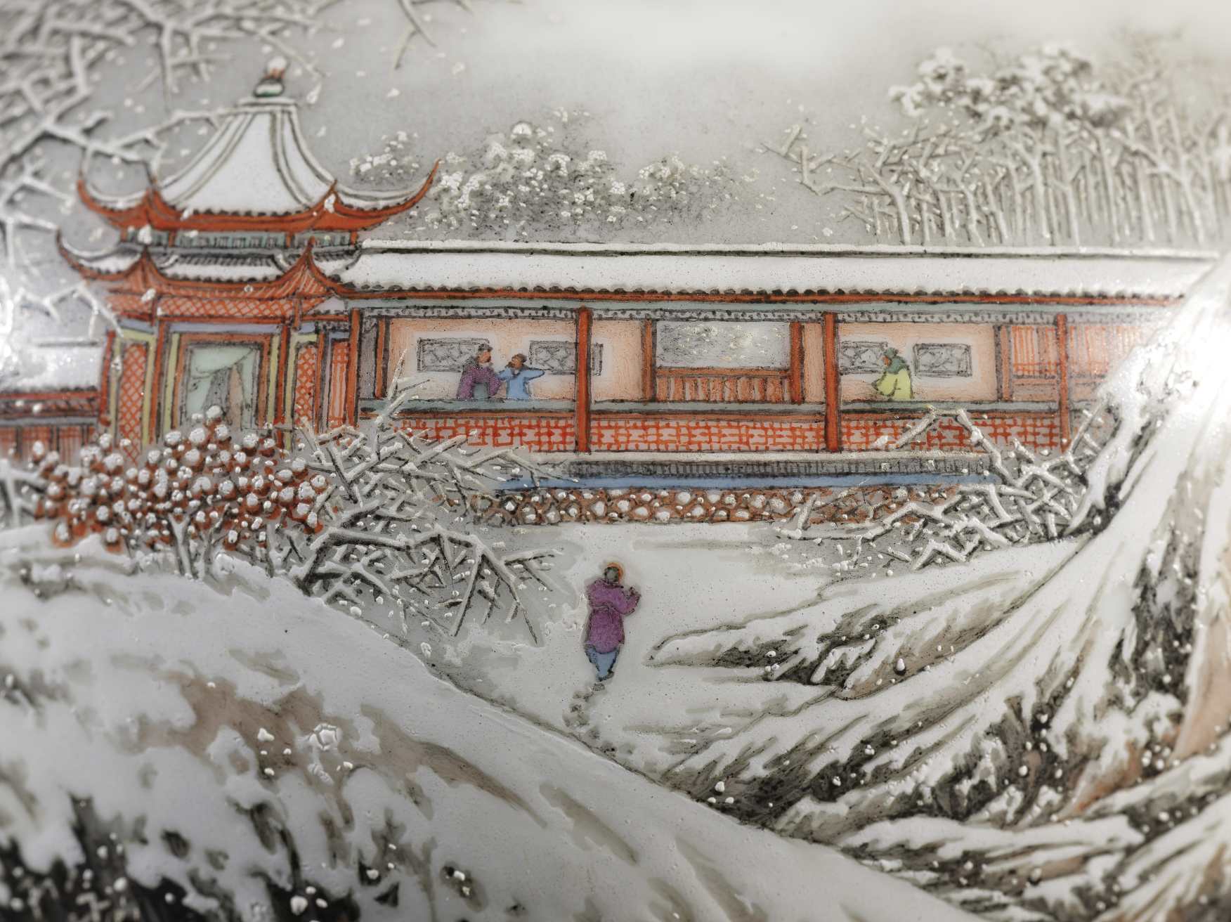 瓶腹正面通景绘“寒江雪霁图”(图二),是余文襄“三远法③构景”的典型体现:近景枯树虬枝裹雪,以斧劈皴④勾树皮肌理,再敷玻璃白显积雪厚度,枝桠间留白透气,得雪压冬云之态;中景亭台楼阁隐于林间,朱红栏柱与白墙覆雪相映,嵌人影若干,衣袂褶皱以淡墨细勾,于冷寂中添生活暖意;远景山峦以淡墨渲染,层叠渐隐,留白作云气,江畔缀有零星人家,江面上有一渔夫正撑杆行舟,于茫茫雪色中破冷调、显生机,暗契“雪境藏春”的创作理念(图三)。
